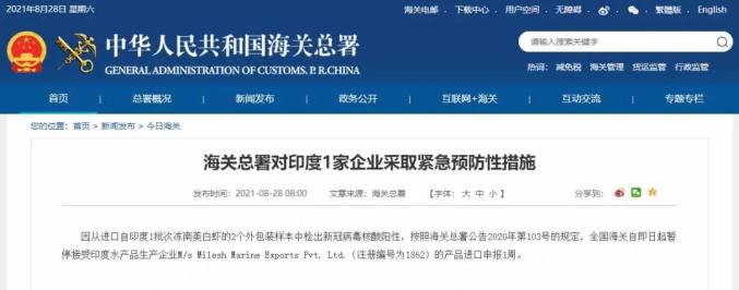 海关总署网站消息,因从进口自印度1批次冻南美白虾的2个外包装样本中检出新冠病毒核酸阳性,按照海关总署公告2020年第103号的规定,全国海关自即日起暂停接受印度水产品生产企业M/s Milesh Marine Exports Pvt. Ltd.(注册编号为1862)的产品进口申报1周。