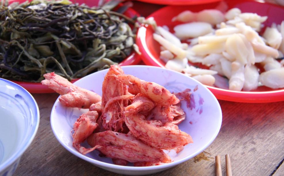 早上起床,要怎么吃这一碗干巴巴的米饭?入乡随俗,十余种酒糟小菜一定要尝一尝,每一样都称得上是庆元人嘴里的精品。