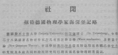 中国《 科学》14 卷3 期有关海森堡来华的报道