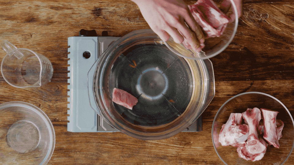 第一步我们要把筒骨、排骨先焯水。冷水下锅,如果热水下锅,血块就会凝结,血沫就不容易被焯出来了。