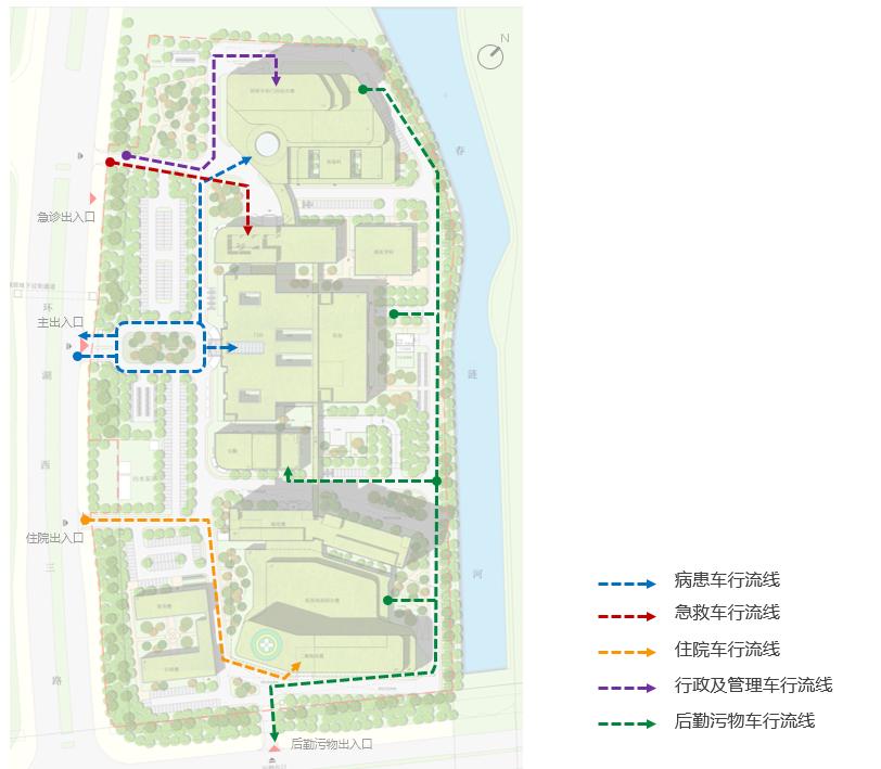 医院内引入沿河景观,住院病房沿河设置。各个建筑空间植入绿色光井、景观庭院,通过形态各异大小不同的采光天窗,将自然光引入室内公共空间,营造平和舒缓的就医环境,体现人文关怀。