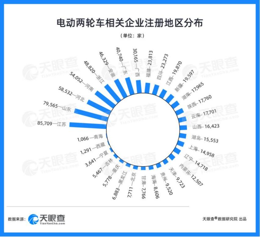 天眼查产业大数据显示,目前我国有超过73万家电动两轮车相关企业,73%的相关企业分布在批发和零售业。地域分布上,江苏的电动两轮车相关企业数量最多,超过8.5万家,占比超12%,其中,无锡有8000多家相关企业,较为知名的有雅迪和新日两家上市企业。山东以近8万家相关企业数量位居第二,河北和河南也均拥有5万余家相关企业。
