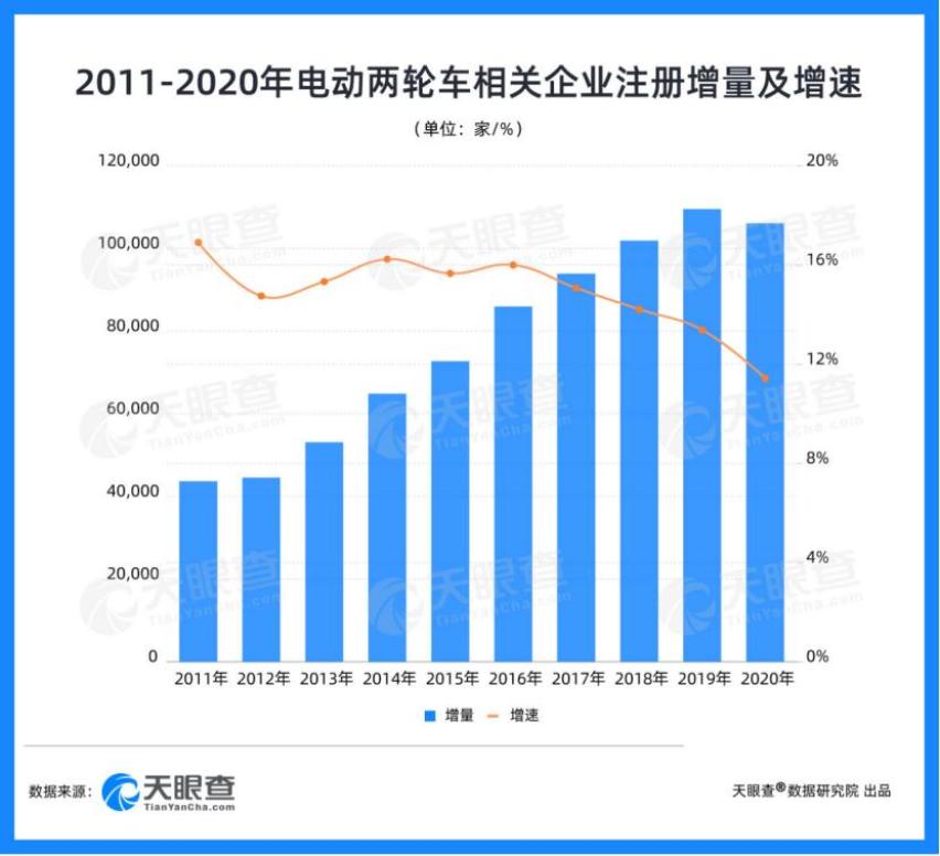 千亿蛋糕的吸引下,竞争者只增不减。近年来,虽然电动两轮车相关企业年度注册增速仍处于渐缓的态势,但相关企业年增量始终保持在一个可观的数量。天眼查产业大数据显示,我国已经连续3年新增超过10万家电动两轮车相关企业。