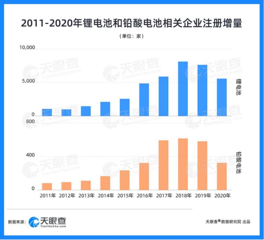 公开资料显示,电动两轮车电池主要有铅酸电池和锂电池两种类型天眼查产业大数据显示,目前我国有超过3.6万家锂电池和超3000家铅酸电池相关企业。两种电池相关企业新入局者最多的年份均为2018年,当年分别新增超8100家锂电池和610家铅酸电池相关企业。