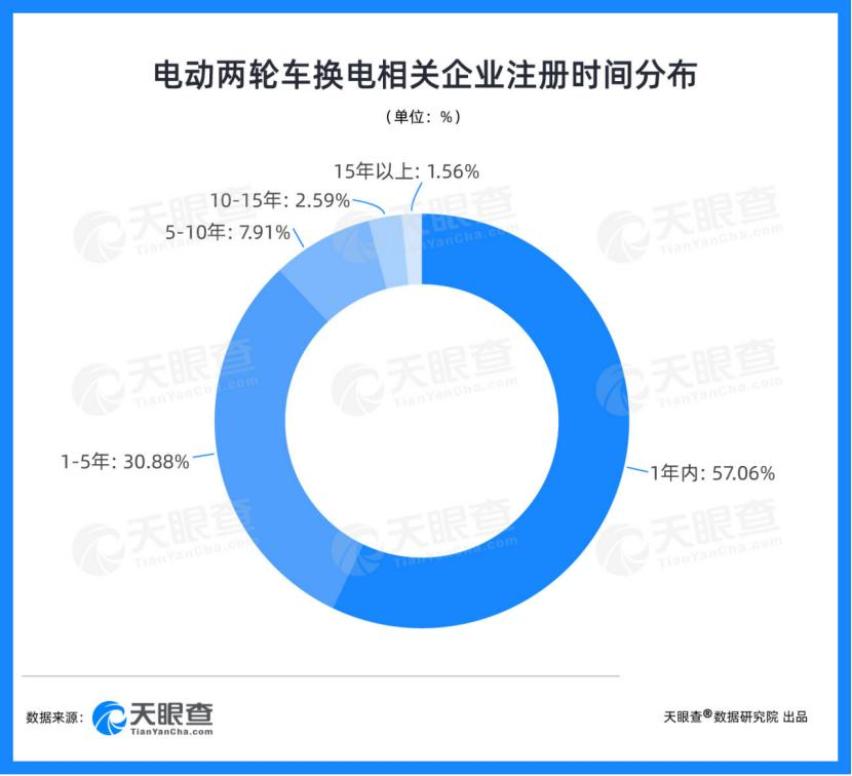 车电分离,把电池作为能源服务的一种载体,在两轮电动车领域已经规模化和产业化。换电服务在两轮电动车市场快速兴起,天眼查产业大数据显示,从2016年开始,我国电动两轮车换电相关企业的注册数量快速上涨,57%的相关企业成立于1年内,另有31%的相关企业成立于1-5年内,仅2020年就新增了1400家相关企业。