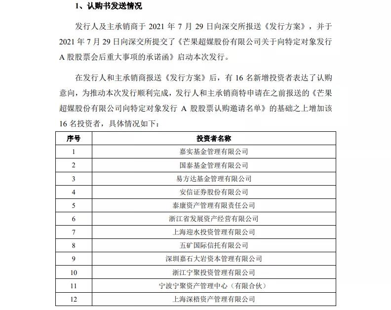 影视龙头股芒果超媒近45亿元的定增项目在今年吸引了包括23家公募基金,36家私募和多家一级市场投资者的热情认购。根据芒果超媒发布的《2020年度向特定对象发行A股股票上市公告书》(简称“公告书”),7月29日向深交所报送《发行方案》后,前后共有106名投资机构或投资者前来认购,具体包括易方达、国泰、嘉实、中欧、兴证全球基金,迎水投资、深圳嘉石大岩资本、宁聚投资、IDG资本等。