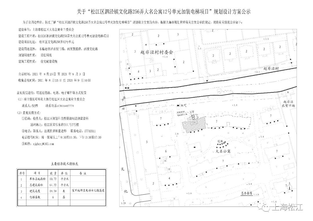 为了让周边单位、居民了解松江区泗泾镇文化路256弄大名公寓12号单元加装电梯工程设计方案的内容,根据上海市城市规划管理有关方案公示的规定,现将有关情况公示如下: