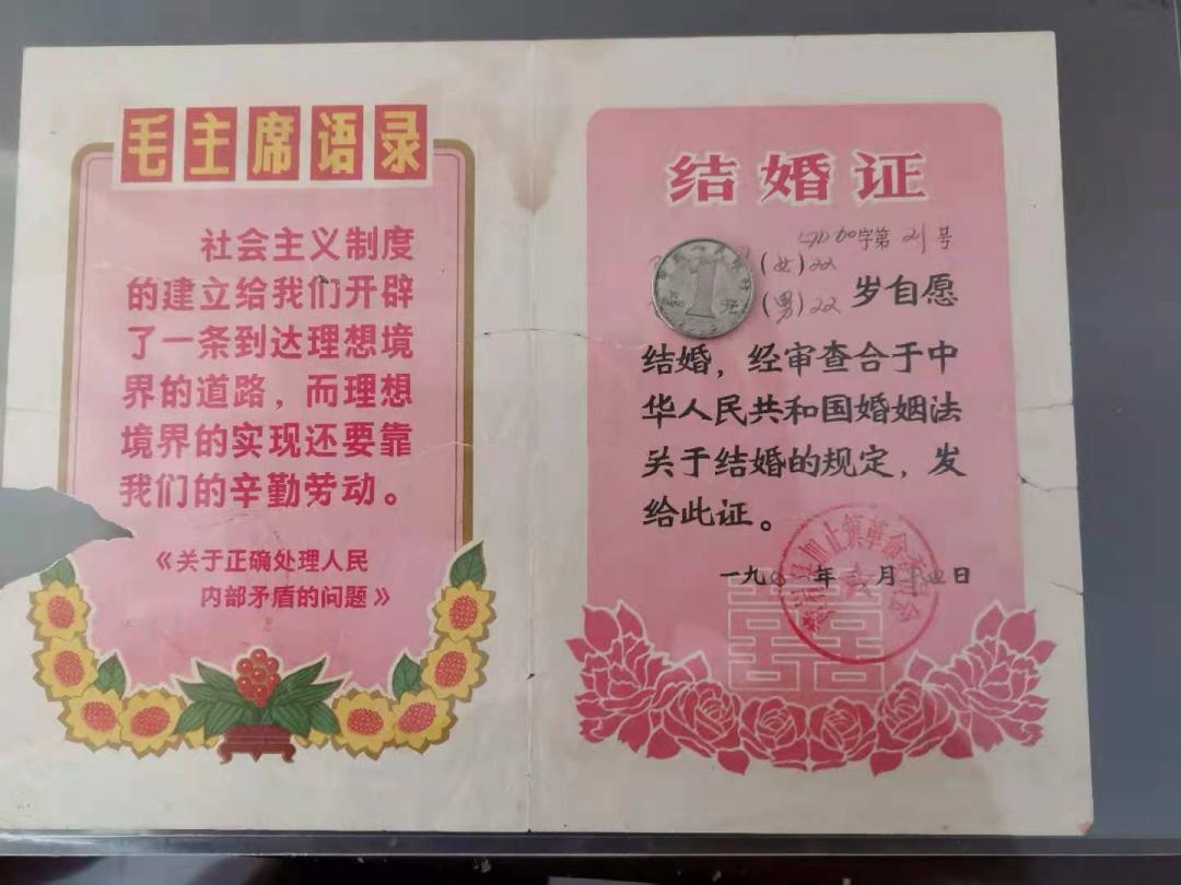 陈万云收藏有1971年的结婚证书,结婚证上盖有“黄岩县‘加止’镇革命委员会”的印章。