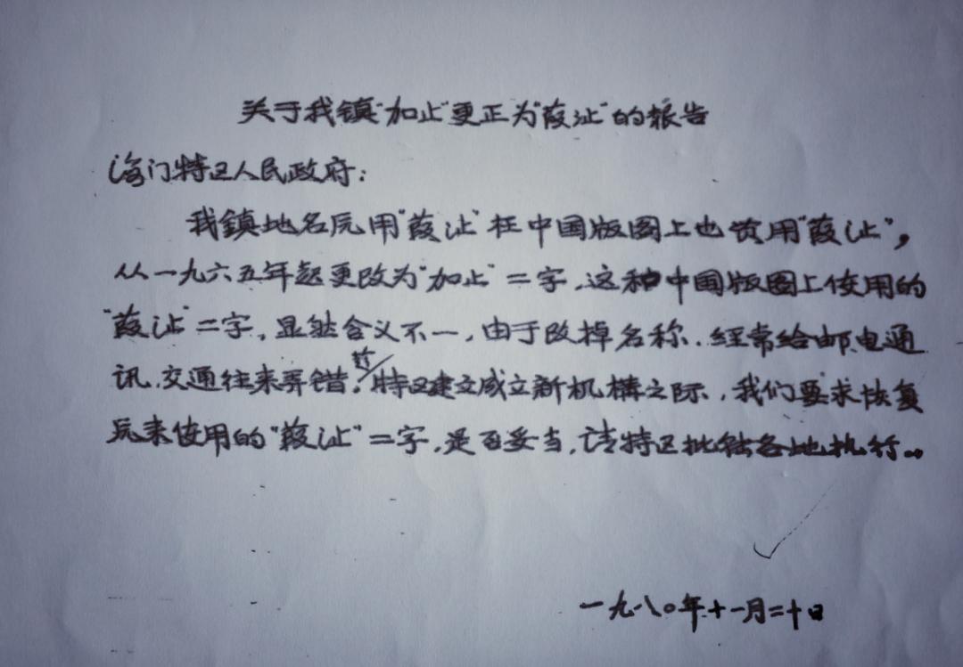 陈万云在查黄岩县人民委员会文件时发现,在1965年3月25日的黄办第085号文件上,明确发文表示,为了方便群众,决定将葭芷镇改名为“加止镇”。
