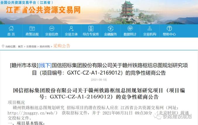 日前,赣州市铁路建设办公室发布了《关于赣州铁路枢纽总图规划研究项目的竞争性磋商公告》。根据公告,赣州铁路枢纽总图规划计划在2021年12月完成国铁集团及江西省政府批复或核备。