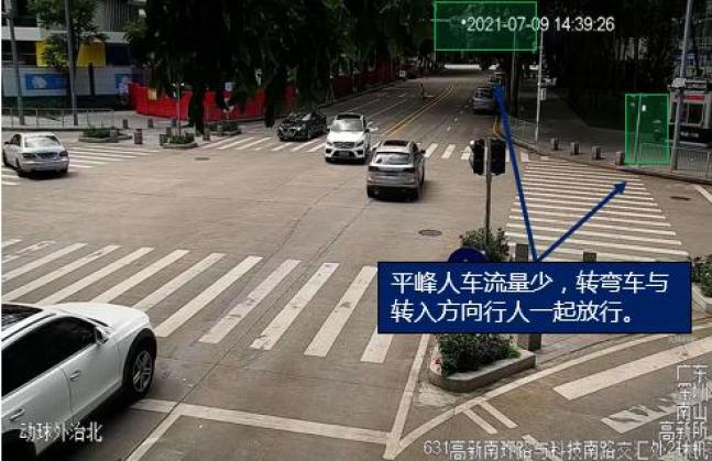 科技/高新南环南路口位于南山科技园南区,该路口平峰时段车流及过街行人流量减少,蜀黍就采取了转弯车与转入方向行人一起放行的交通信号放行方案,效率与安全并行。