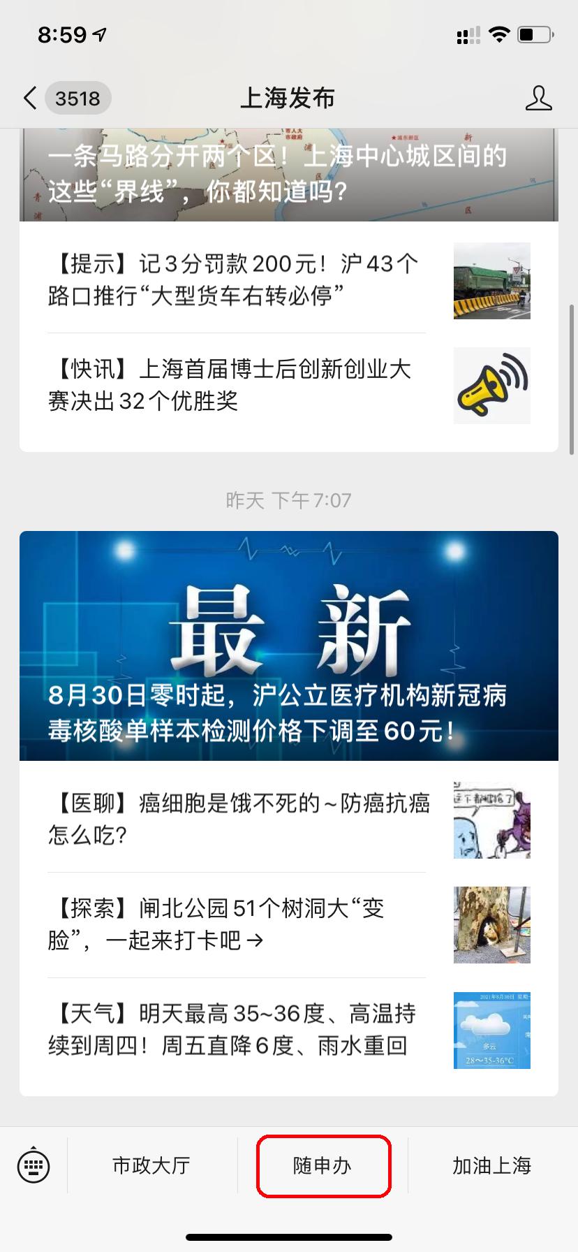 方式一:从“上海发布”微信公众号进入“随申办”微信小程序。