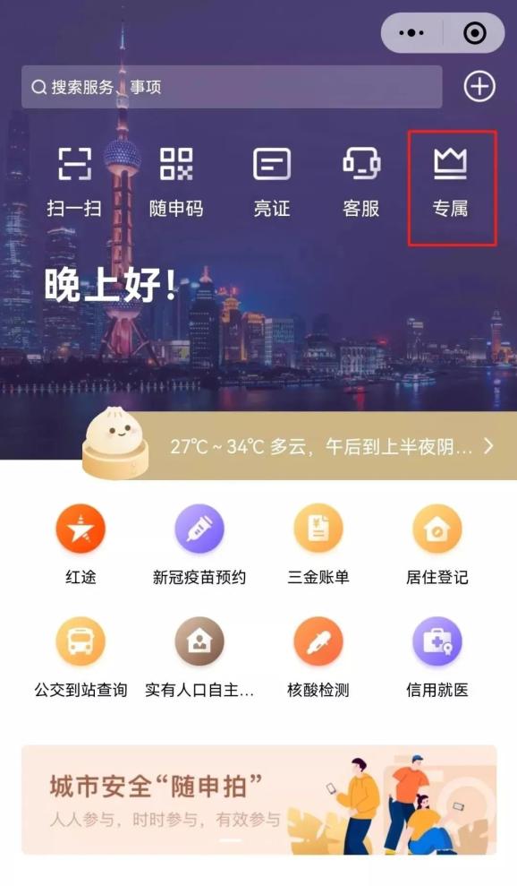 方式二:登录“随申办”APP或“随申办”支付宝小程序,在首页点击“专属”进入“专属”空间。