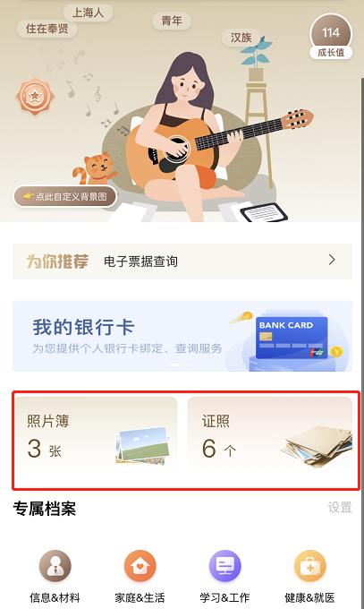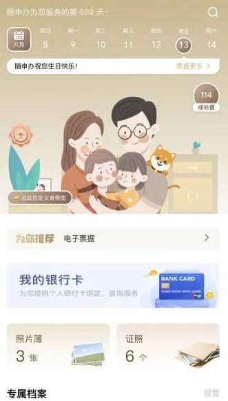 本次改版将照片与证照加入首页醒目位置,方便用户查看和使用。点击“照片簿”,可查看所有照片信息;点击“证照”,可查看所有电子证照材料与被授权证照信息。