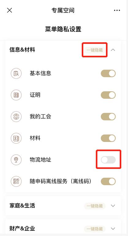 在“隐私”中,点击“一键隐藏”可隐藏该档案中的所有子功能;点击子功能右侧的图标,可隐藏相应子功能。
