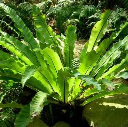 鸟巢蕨,又名山苏花,属多年生阴生草本观叶植物。植株高80-100厘米,根状茎直立,粗短,木质,叶簇生。鸟巢蕨是一种附生的蕨类植物,常附生于雨林或季雨林内树干上或林下岩石上,喜高温湿润,不耐强光。