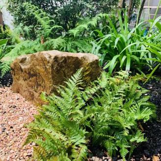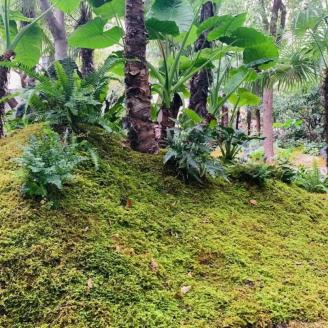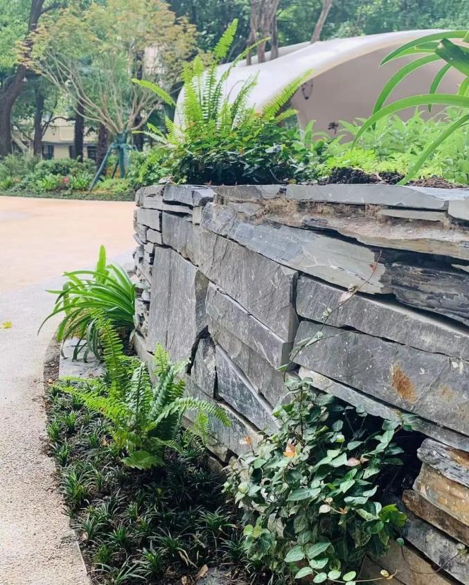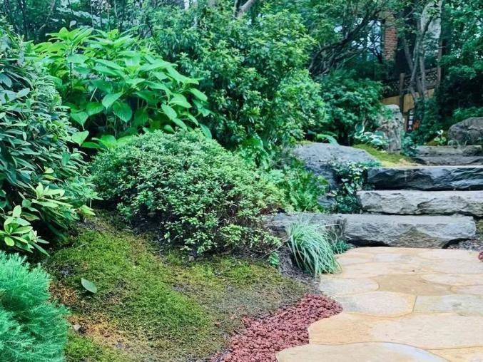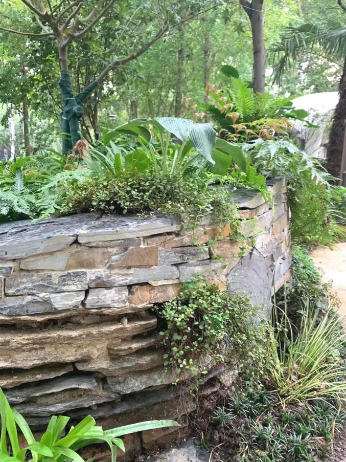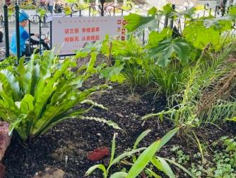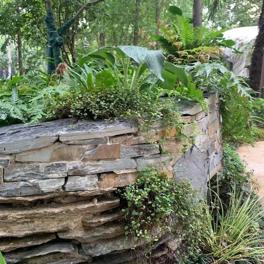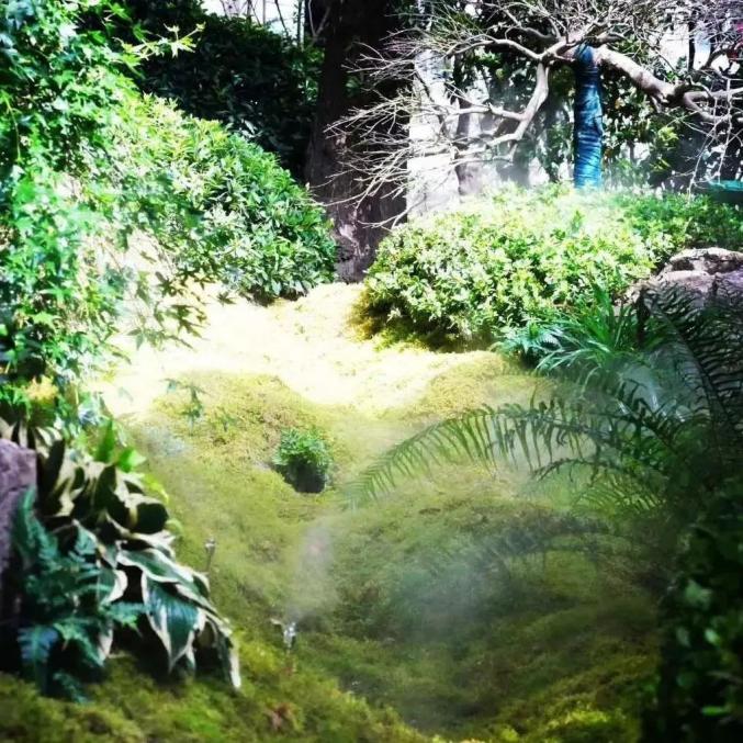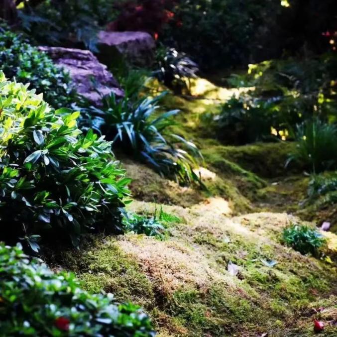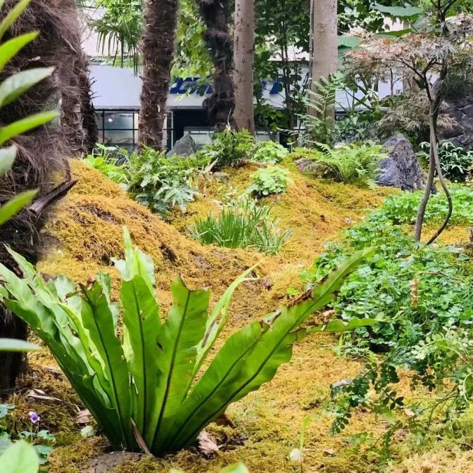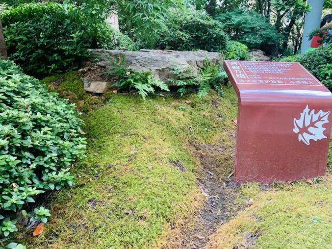 衡山绿地内,矮小纤细的苔藓仿佛一席毛茸茸的绿色地毯铺展开来。铁线蕨、冬青蕨等蕨类植物绿意盎然,两侧点缀置石并种植了花叶络石等具有吸附和缠绕攀援能力的植株,打造出了富有层次的绿化景观。