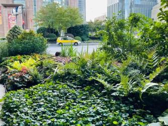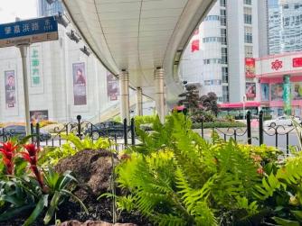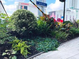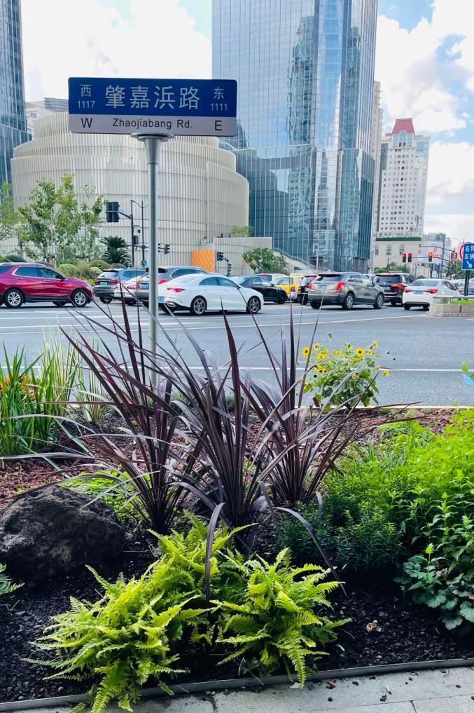 徐家汇天桥下,鸟巢蕨、玉簪、水塔花、千叶兰、波士顿蕨等阴生植株高低错落、形态优雅;肇嘉浜路沿线,蔚然成片的绿色植物仿佛给炎炎夏日带来了一阵清新的风。