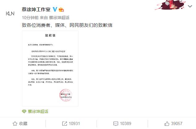 原标题:《刚刚,蔡徐坤工作室致歉》