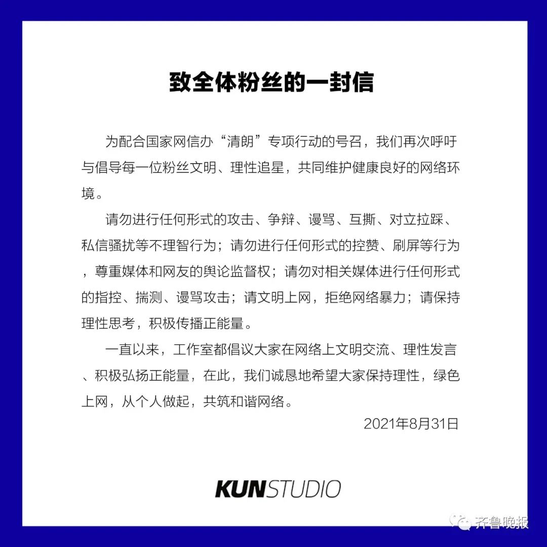 同时工作室还发布《致全体粉丝的一封信》,呼吁粉丝保持理性文明交流。