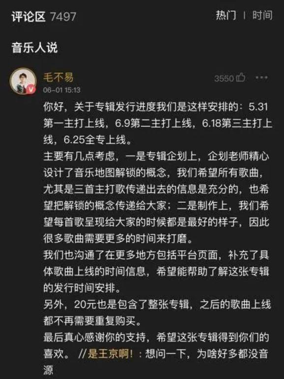 毛不易在平台评论区回应质疑:“20元是包含了整张专辑,之后的歌曲上线都不需要重复购买。”在毛不易的回复中,也明确提及了分批上线歌曲是出于企划和制作的考虑。这也表明在数字专辑时代,专辑不再是制作完毕才能发行,而可以处于“动态”制作中。