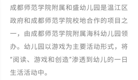 成都师范学院附属和盛幼儿园坐落于美丽的花语小镇“和盛镇”,幼儿园占地面积约4亩,建筑面积2145.12平方米,共配备6个教学班,可提供180个学位。