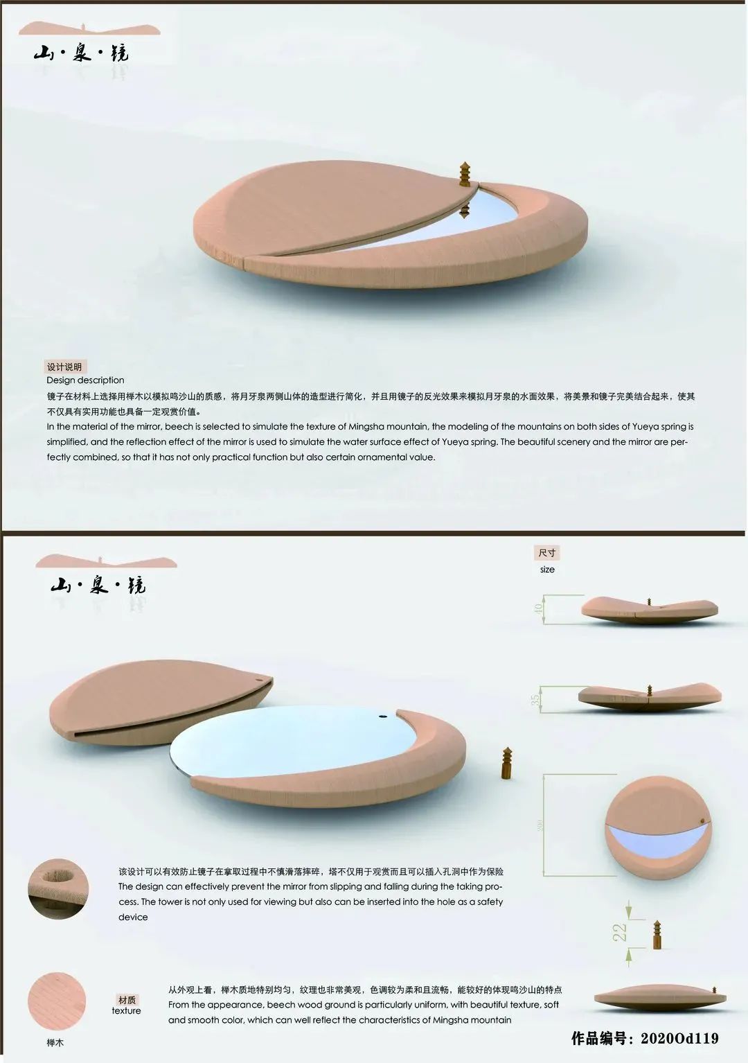 由月牙泉的水面倒影联想到镜子的效果,本款产品在材料上选用与沙砾颜色相似的实木,在设计上简化了月牙泉两侧的山体造型和建筑物,并将其体现在产品造型上,使其不仅具有镜子的功能,而且也可以作为一件工艺品供人观赏。