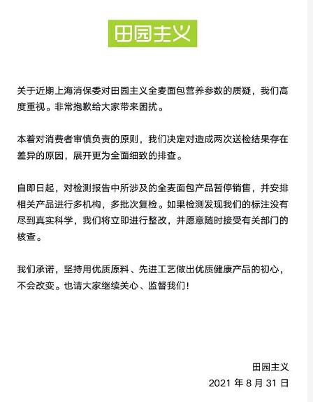 8月31日,田园主义官方微博表示“非常抱歉给大家带来困扰”,并回应称:“本着对消费者审慎负责的原则,我们决定对造成两次送检结果存在差异的原因,展开更为全面细致的排查。自即日起,对检测报告中所涉及的全麦面包产品暂停销售,并安排相关产品进行多机构、多批次复检。如果检测发现我们的标注没有尽到真实科学,我们将立即进行整改,并愿意随时接受有关部门的核查。”