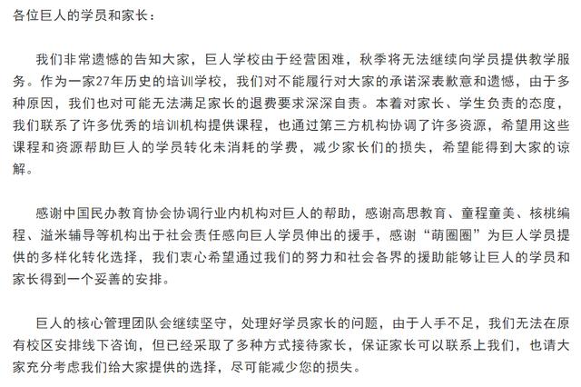 巨人教育同时在声明中表示,核心管理团队会继续坚守处理好学员家长的问题,但由于人手不足,机构无法在原有校区安排线下咨询,但已经采取了多种方式接待家长,保证家长可以与机构取得联系。