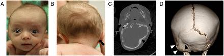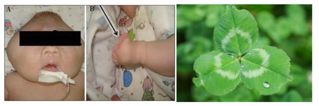 最常见的是冠状缝和菱形缝(前囟门)过早接合,导致颅骨明显膨出头部位于前囟区和颞区外侧,具有典型的“三叶草”外观。文献中首次报道此类综合征发生在 1973 年,多年来只有几十例已在世界范围内记录。
