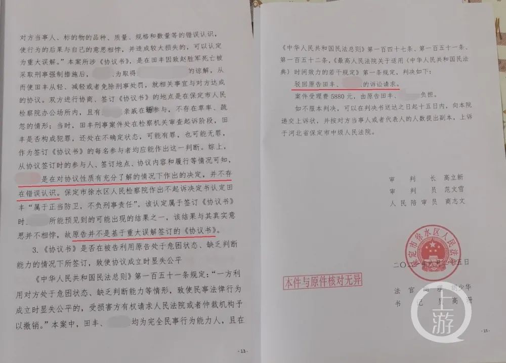 徐水区法院认为,协议书是在保定市检察院签订,不存在草率、疏忽。协议书的签订者应能作出判断:田丰是否有罪还处于不确定状态,可能有罪,也可能无罪,“属于正当防卫,不负刑事责任”属田丰妻子能预见的结果之一。