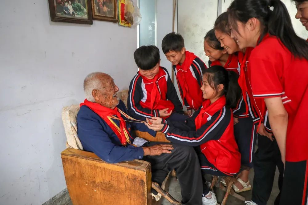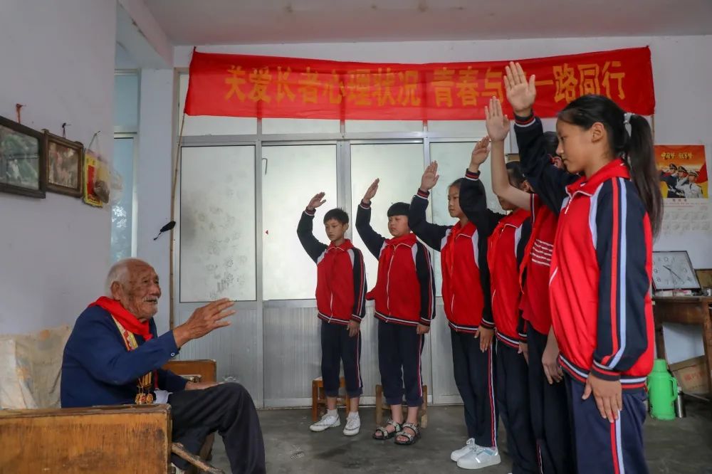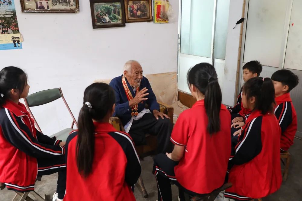 9月1日,薛庄镇抗大小学组织优秀少先队员到92岁抗战老兵苏立圣家中开展志愿服务活动,听苏爷爷讲述亲身经历的革命战争故事,开启新学期的开学第一课。