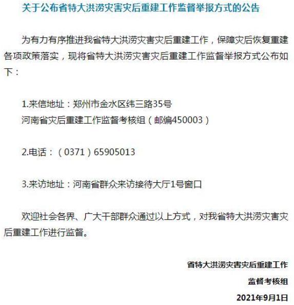 3)9月1日,河南公布特大洪涝灾害灾后重建工作监督举报方式。欢迎社会各界、广大干部群众通过以上方式,对我省特大洪涝灾害灾后重建工作进行监督。