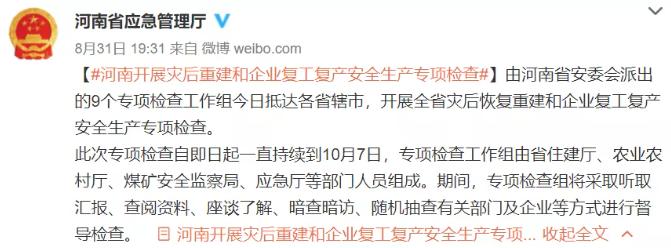 4)据河南省应急厅消息,由河南省安委会派出的9个专项检查工作组已抵达各省辖市,开展全省灾后恢复重建和企业复工复产安全生产专项检查。此次专项检查持续到10月7日。