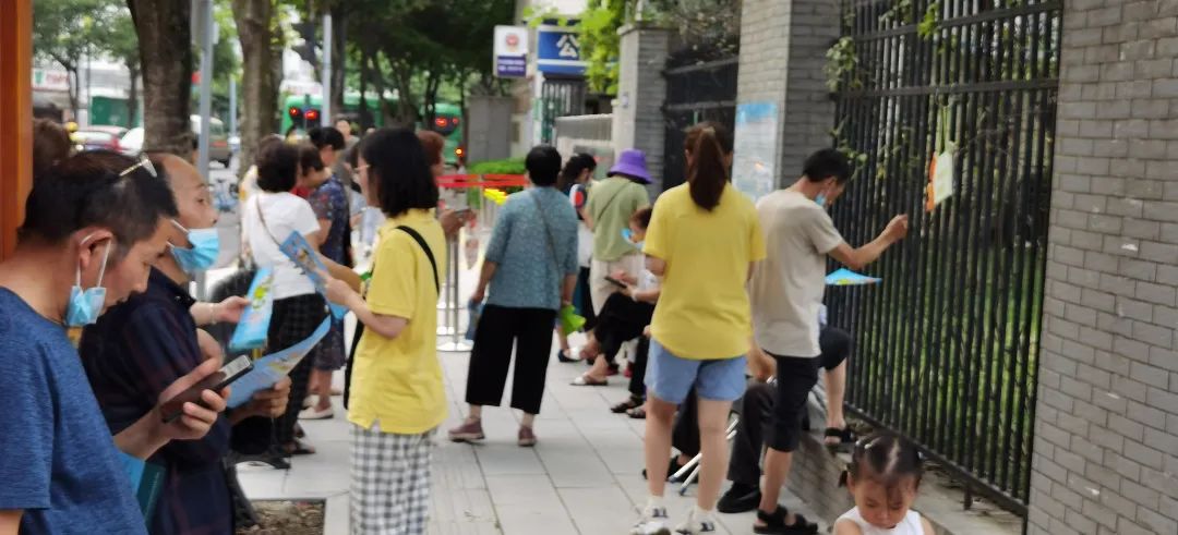 成都某小学外,9月1日晚下午5点过,家长们等待孩子结束“学校延时服务”后放学。仍有校外培训机构发放招生广告,但几乎都是非学科类。