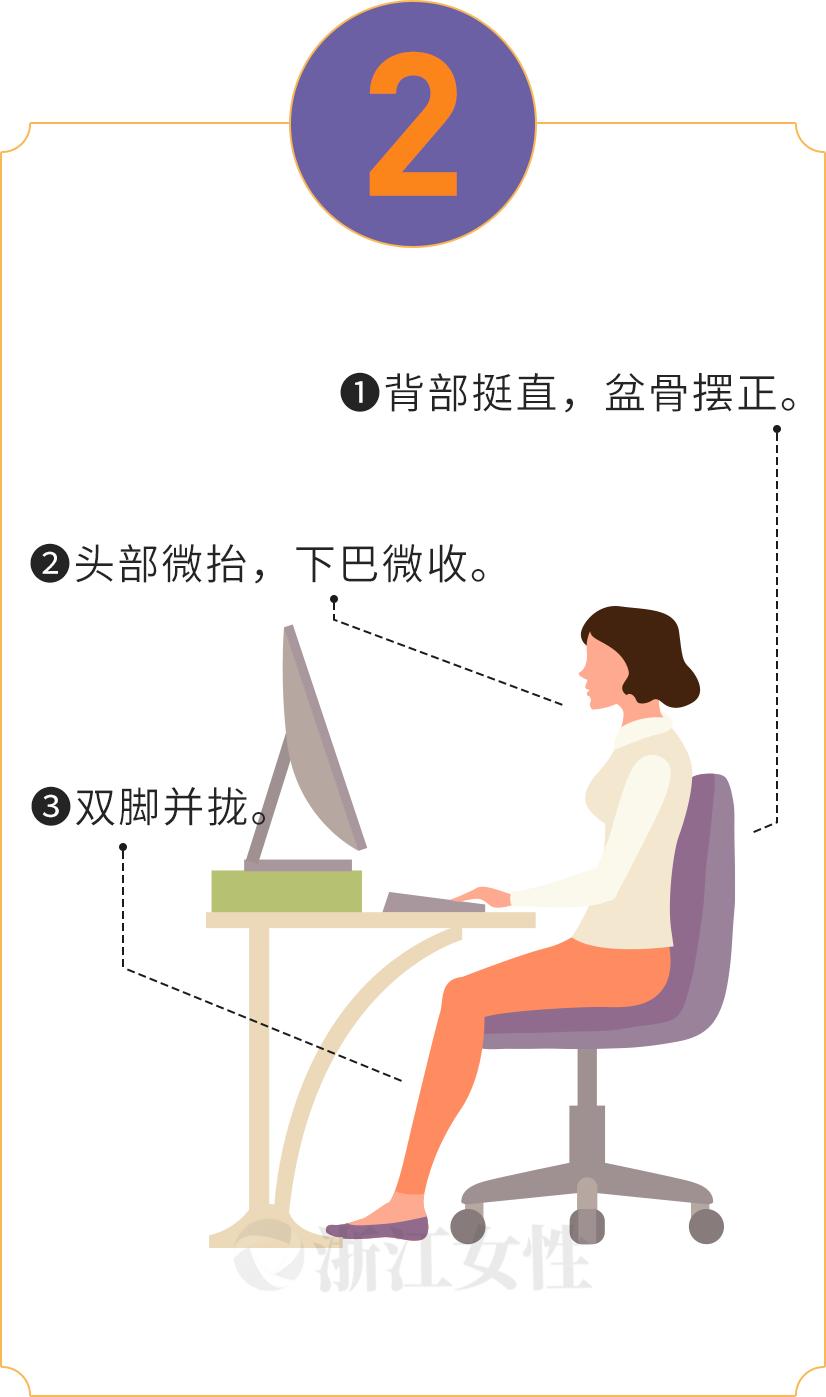 保持背部挺直坐于座位,双手放后脑勺,手肘左右打开,一边合拢手肘,一边慢慢下压。