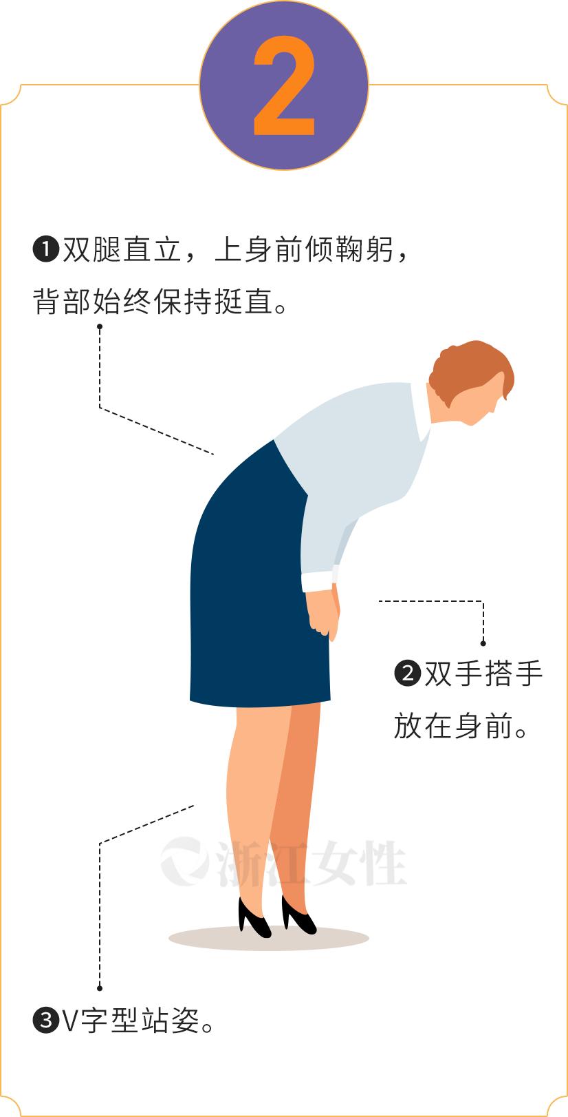 行鞠躬礼前应面对对方,并拢双脚成V字型站姿。