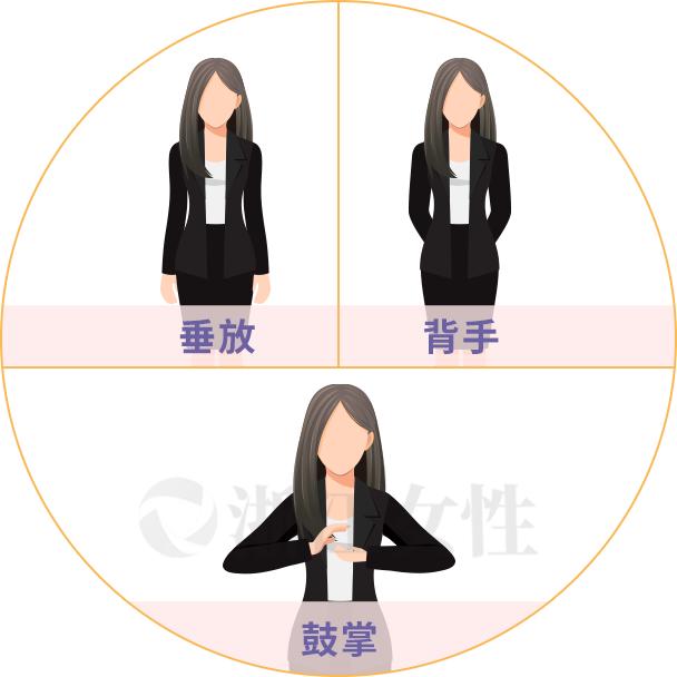 垂放是最基本的手姿。站立时,双手自然下垂,掌心向内,叠放于腹前,或贴放于大腿两侧。