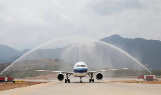 9月2日,韶关丹霞机场迎来历史性跨越!12时23分,一架南航A320客机平稳降落在丹霞机场跑道,并缓缓滑入停机坪,机场以民航最高礼仪“过水门”仪式迎接,标志着韶关丹霞机场试飞取得圆满成功。此次试飞是韶关丹霞机场继8月21日校飞成功后,为实现年内通航目标所完成的又一个重大节点。韶关市委书记王瑞军、市长陈少荣,民航中南地区管理局副局长戚俊,广东机场集团党委书记、董事长张克俭等领导在机场迎接机组人员,并为他们送上鲜花。
