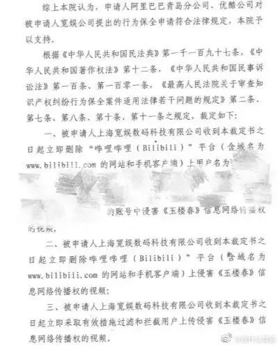8月20日,因B站侵权正在热播的《玉楼春》,青岛市中级人民法院发出诉前禁令裁定书,要求B站立即删除相关侵权视频。