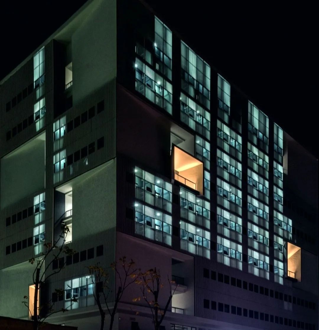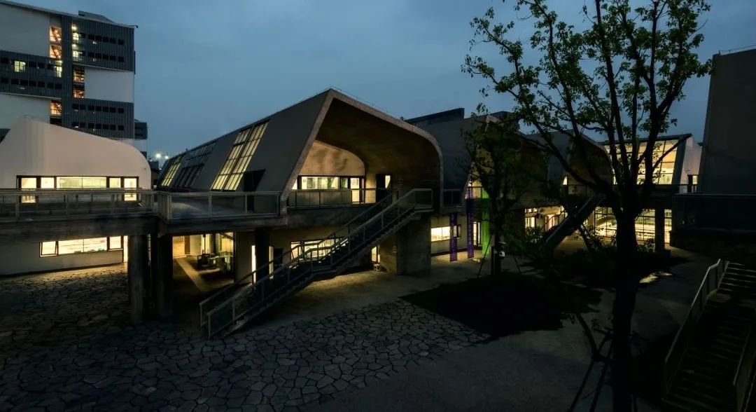 在校区空间布局上,则大多采用“差序院群”,即通过绵延工坊的单位错落形成“大中小微”的院落层次,例如宿舍楼底层被设计为对应“学社制”的学社空间,用以共同兴趣为核心的学生自组织课余使用。由于位于工坊与宿舍之间,学社既是水平工坊在宿舍的“教学绵延”,又是垂直宿舍在底层的“生活沉淀”,从宿舍途径学社进入工坊,“下楼”即可“上课”,传统校园成为了“居学一体”的垂直分层关系,从而进一步强化了一种有别于正式教学、面向自主学习和终身学习的“软教学”氛围,因此“绵延多义的工坊空间、居学一体”的学院生活得以实现。