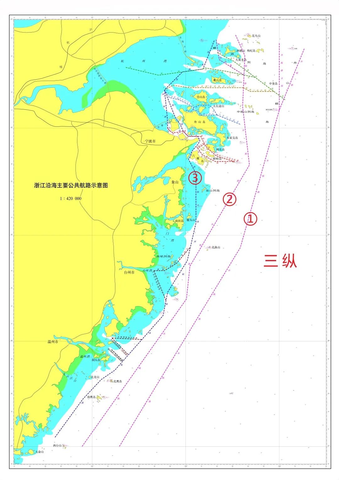 “三纵”以“理顺船舶交通流、服务国家战略物资运输通道安全、防范和遏制商渔船碰撞事故”为主线,北接上海,南连福建,是船舶南北向通道,也是中国沿海通航功能区的重要组成部分,从东向西由“外航路、东航路、西航路”组成。