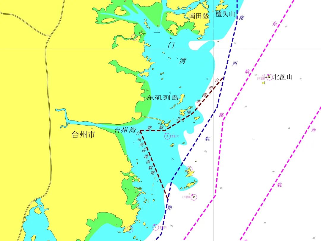 台州湾进港航路:由南向航路和北向航路两条组成,东起西航路,西至海门港1号灯浮,主要服务海门、黄岩、灵江等港区。