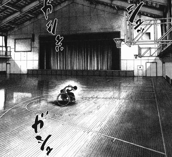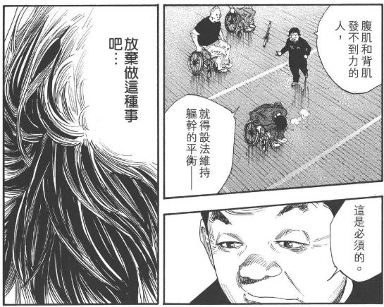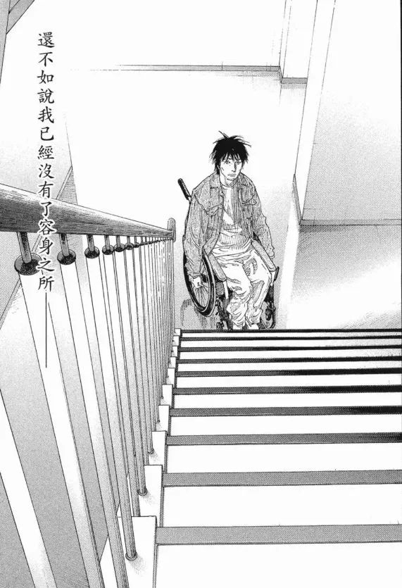 井上雄彦在《REAL》中同样描画了大量健全人的真实生活,在这些真实生活中,前一页他们可能血脉偾张,包含对未来的憧憬和热情,而在下一页,这些人就可能被生活无情迎面一击,在失学、失业、离婚中猝然倒地。这种猝然倒地,和残障人士横遭车祸或者罹患疾病,并无本质差别。