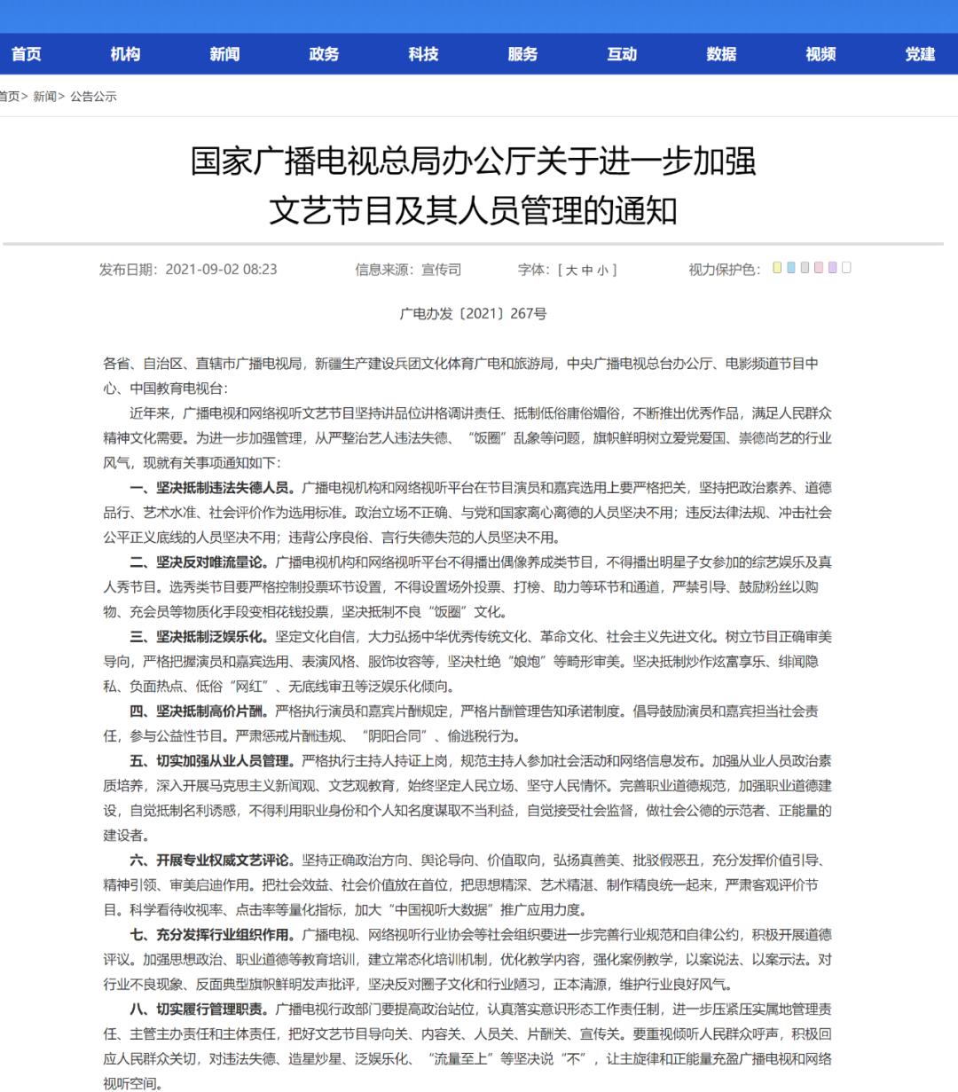 同日,国家广播电视总局发布《国家广播电视总局办公厅关于进一步加强文艺节目及其人员管理的通知》,要求广播电视机构和网络视听平台不得播出偶像养成类节目,不得播出明星子女参加的综艺娱乐及真人秀节目,同时坚决杜绝“娘炮”等畸形审美。