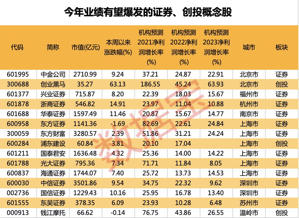 15只证券、创投股今年业绩有望大爆发。