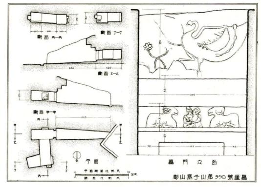 图2 彭山第550 号墓平、剖面图及木门石刻详图