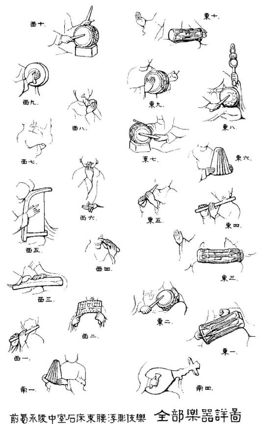 图10 永陵中室石床束腰浮雕伎乐全部乐器详图