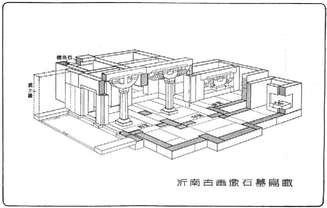 1954 年华东文物工作队与山东省文物委员会发掘沂南古画像石墓。当时在南京工学院担任教授的刘敦桢先生曾对报告的编写进行指导。而负责报告编写的曾昭燏先生也曾提及她参考了陈明达先生在彭山崖墓工作中所采用的建筑学方法。沂南汉墓中的仿木构石刻部分相对简单,因此在讨论墓葬建筑时重在其结构,但涉及柱额、斗栱等结构时仍采用了《营造法式》中的术语,并且同样以透视图表现墓葬空间(图12)。