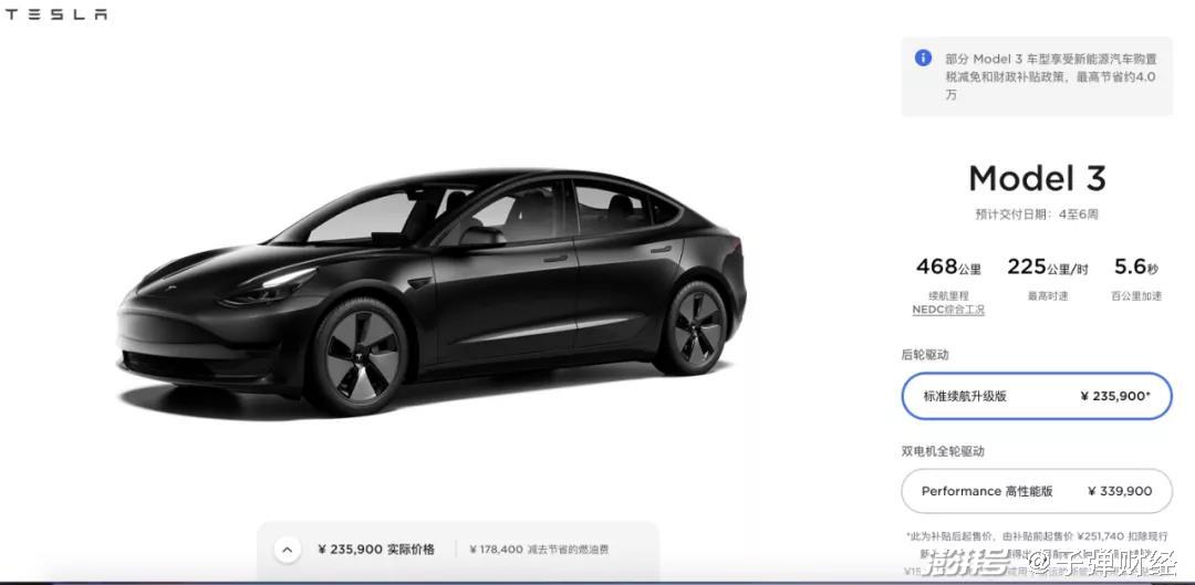 以特斯拉主力车型Model 3为例,公开资料显示,2019年2月Model 3刚进入中国市场时,其售价最便宜的Model3长续航后驱版的起售价达到43.3万元。2019年10月,特斯拉发布国产Model 3标准续航升级版,售价35.58万元。